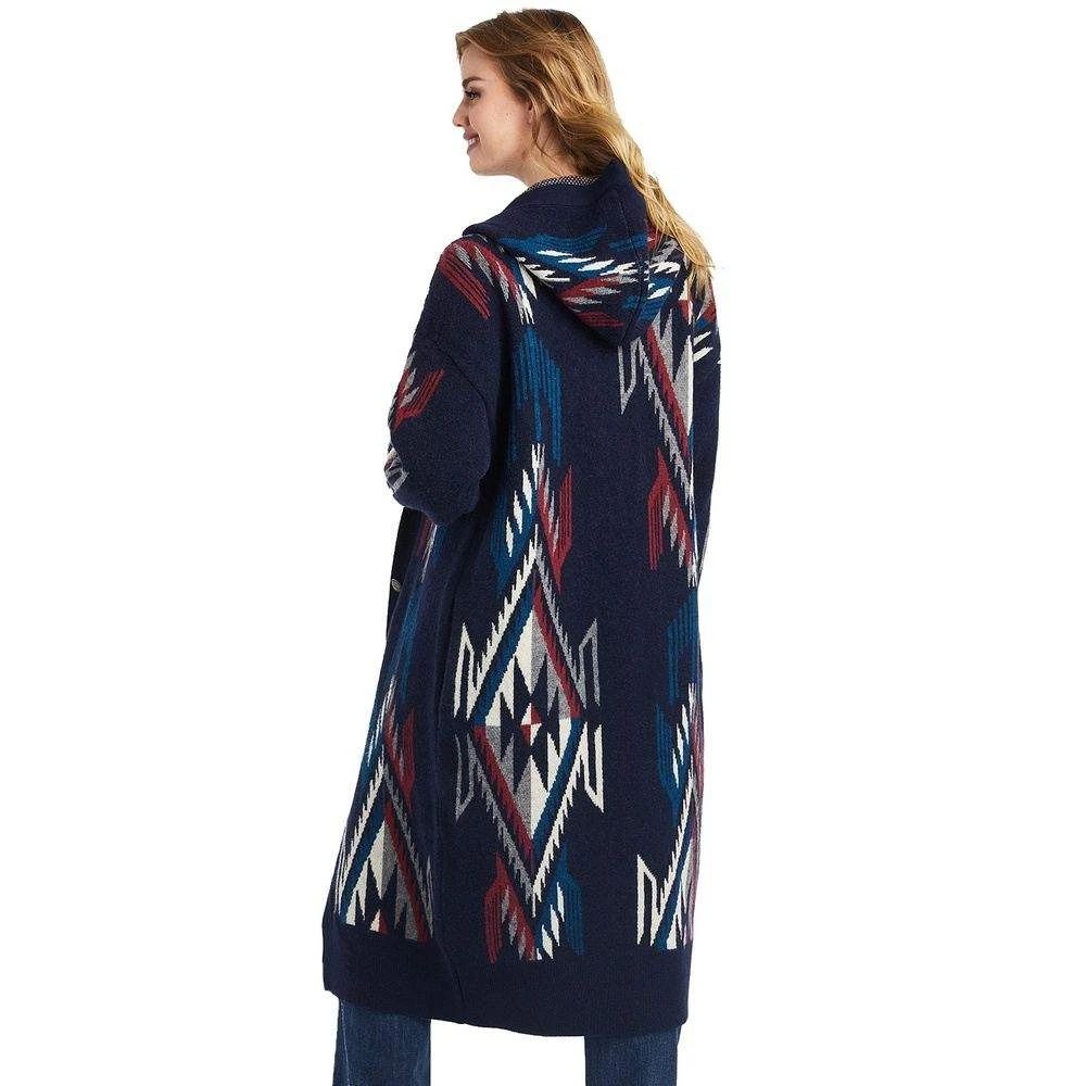 Very cozy and oh-so-soft, this long duster-length sweater features a Chimayo weaving-inspired pattern that was created by the artists at Centinela Traditional Arts. Paired with leggings or dressed up with denim, it brings a touch of sophistication to any outfit.