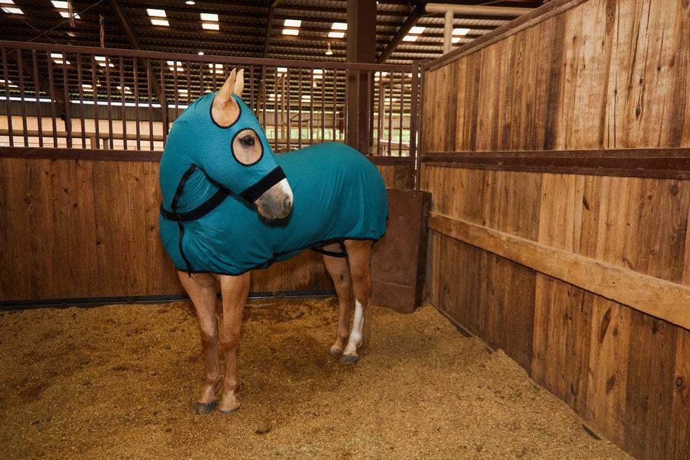 90% NYLON, 10% SPANDEX. Incredibly durable with great 4-way stretch for comfort and fit. The mesh allows for ample ventilation in summer and protects haircoat from sun and insects. Revolutionary durable sports fabric that is good for stall, pasture, and paddock wear. Zips open so nothing goes over the head w/ a covered zipper and belly wrap and rear leg straps that keep it from shiffting. Machine wash and dry in minutes.