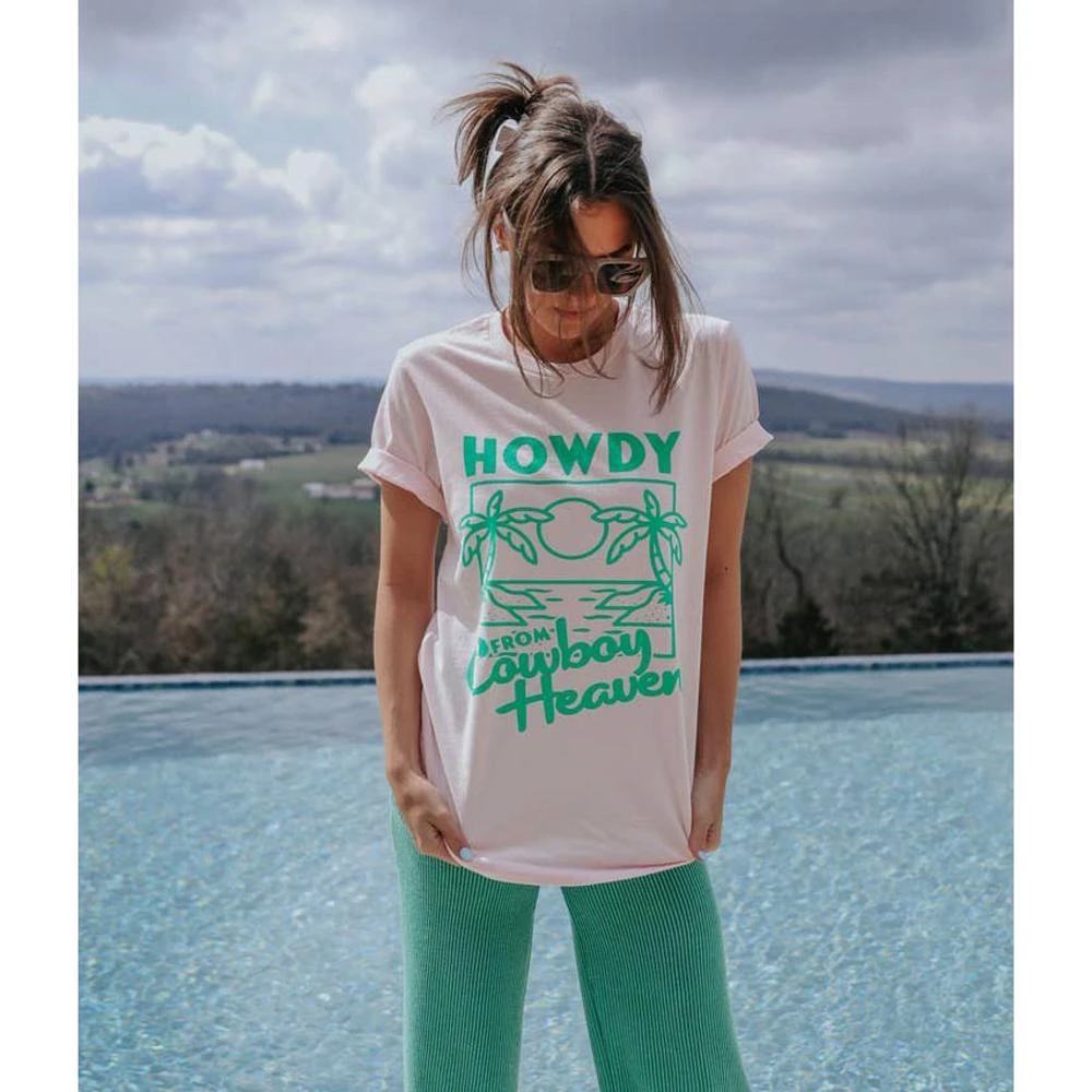 This tee is perfect for vacation with all your cowgirls with the bright green text on a baby pink, short-sleeved tee.