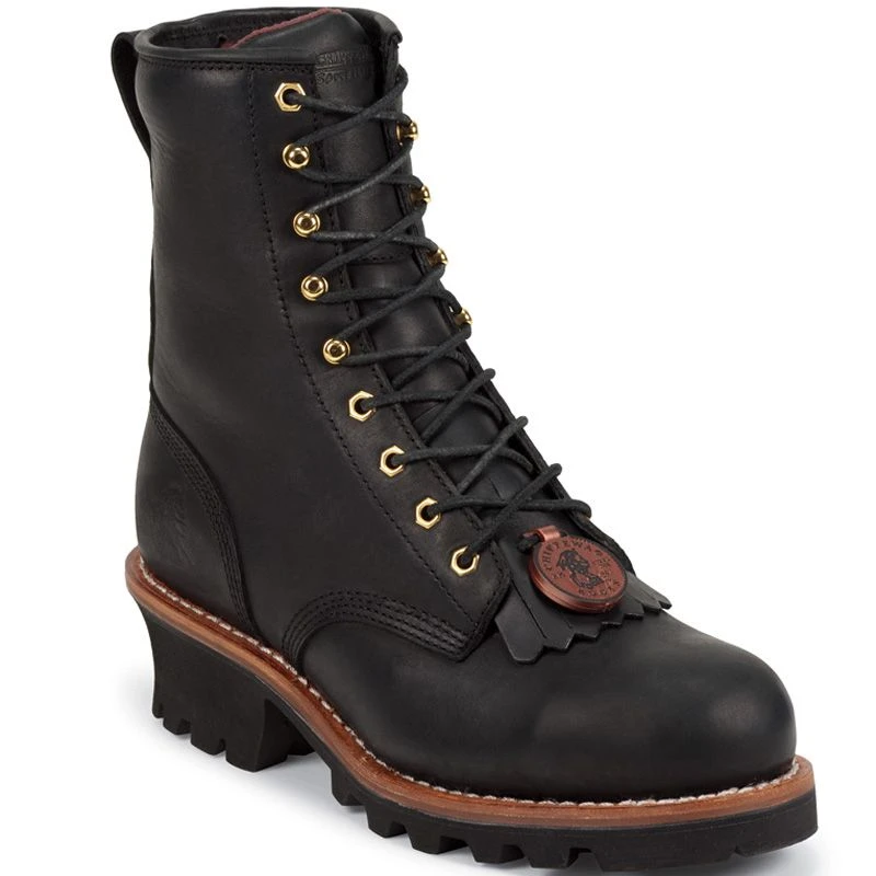 This Men’s Chippewa 8in Black Steel Toe Logger Lace Up Boot is a great boot for any kind of outdoor activity you are wanting to do. This boot features black oiled leather, goodyear leather welt construction, vibram one piece yellow plug logger outsole, antique brass non tarnishable hardware, heavy duty laces, and ASTM electrical hazard rated.