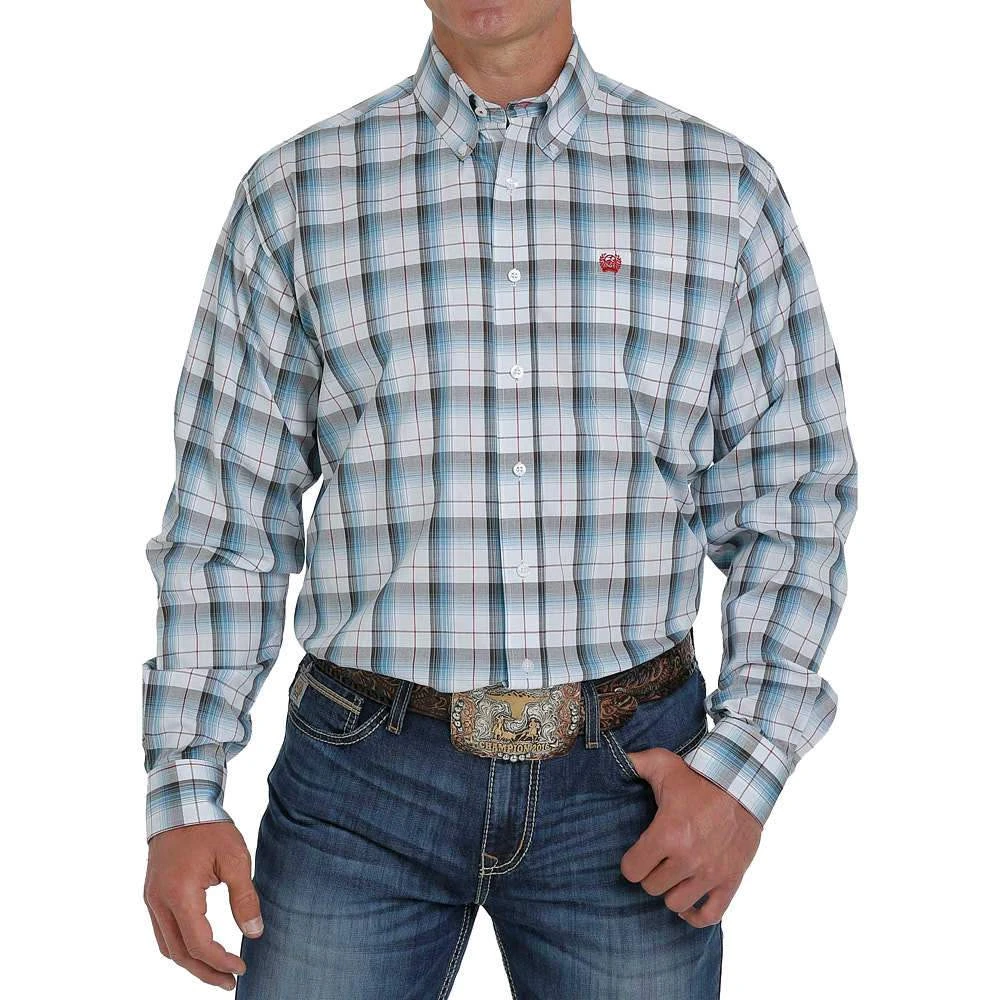 On or off the range, experience the ultimate in comfort, style and wearability with a classic light blue plaid shirt by CINCH. Designed to stretch with you, this cotton-spandex plain weave features a left front pocket with logo embroidery and white buttons.
