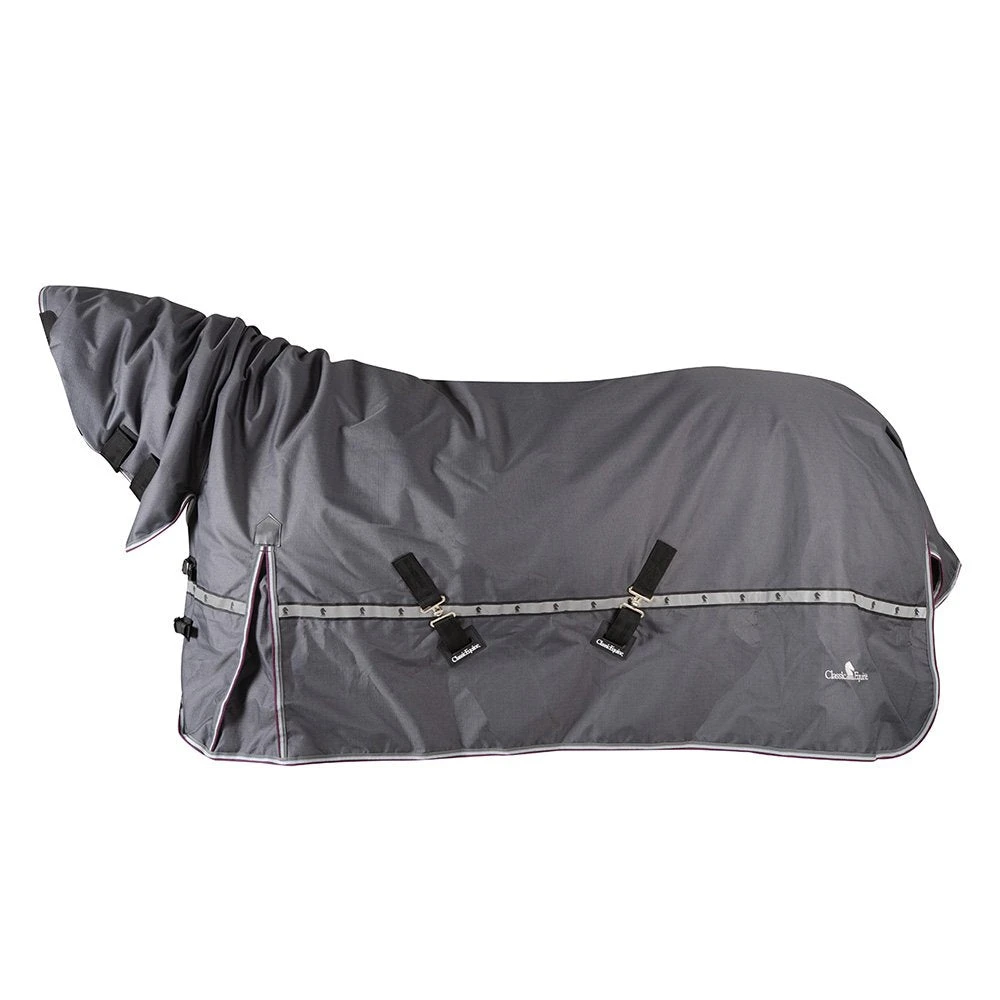 1200 Denier breathable ripstop outer shell is waterproof and extremely durable horse blanket. 100 Grams fiberfill insulation is ideal for milder fall or winter temps, with nylon lining that polishes the coat. Contoured design helps keep blanket stationary while eliminating pressure points. Fitted shoulder darts and fleece lining eliminate rubbing. Nylon straps are replaceable, to greatly extend blanket life. Waterproof seam tape and rear tail flap provide superior protection against wind and rain. Reflective Knight Vision™ safety strip maximizes visibility in low light. The attached hood stays flush on the neck with adjustable hook and loop straps.