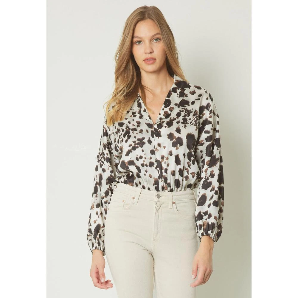 Animal print v-neck collared bodysuit featuring hook and eye closure at bust