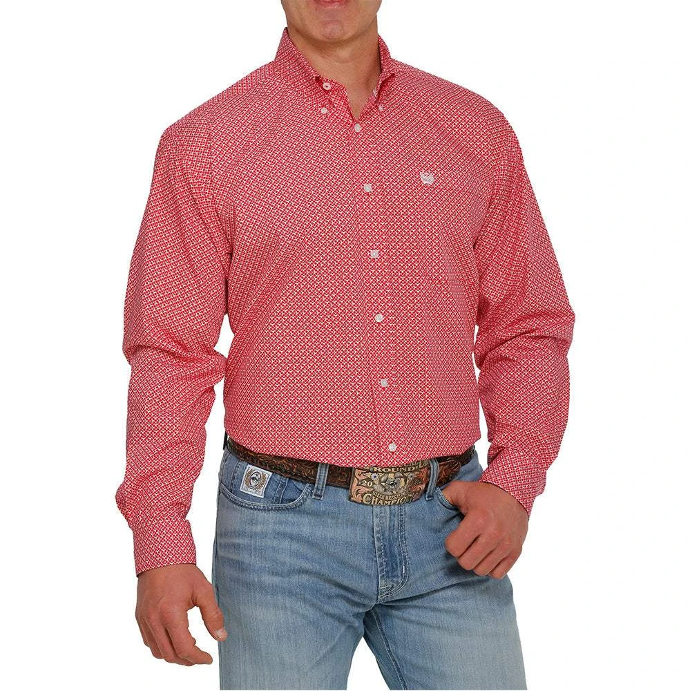 Bold red and an allover geometric pattern come together in this classic cotton plain weave shirt engineered by CINCH. Design details include an open left front pocket, embroidered logo and traditional white buttons.