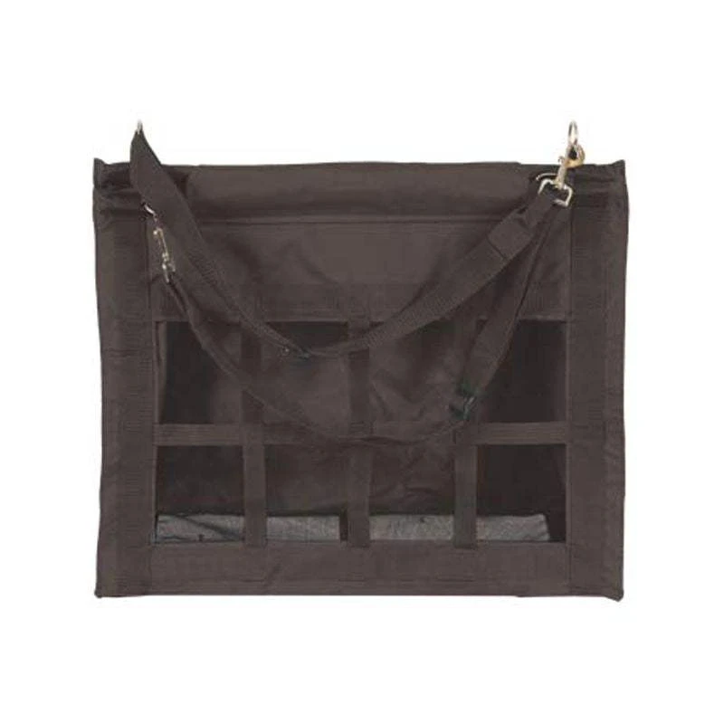 This Deluxe Top Load Hay Bag is extra large making it very easy to fill. It features a top flap that velcros shut so hay can’t be drug out of the top. It also features a long adjustable strap with snaps making it easy to hang almost anywhere. The hay must be pulled from the webbed squares in front which lessens waste. The front and back are made of tough poly for durability and the bottom is mesh allowing dust and dirt to fall through.