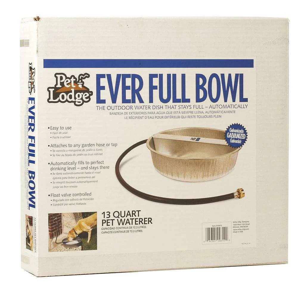 The outdoor water dish that stays full! Simply attach the 3/4 inch hose (included) to your garden hose, turn on the tap, and the bowl fills to the perfect drinking level. The automatic float controls the water level so there is no spilling or overflow. The bowl is automatically replenished every time your dog drinks, so the water always stays fresh. Made of chew-proof, rust-resistant galvanized steel for years of service. Comes fully assembled. Holds 13 quarts (3.25 gallons).