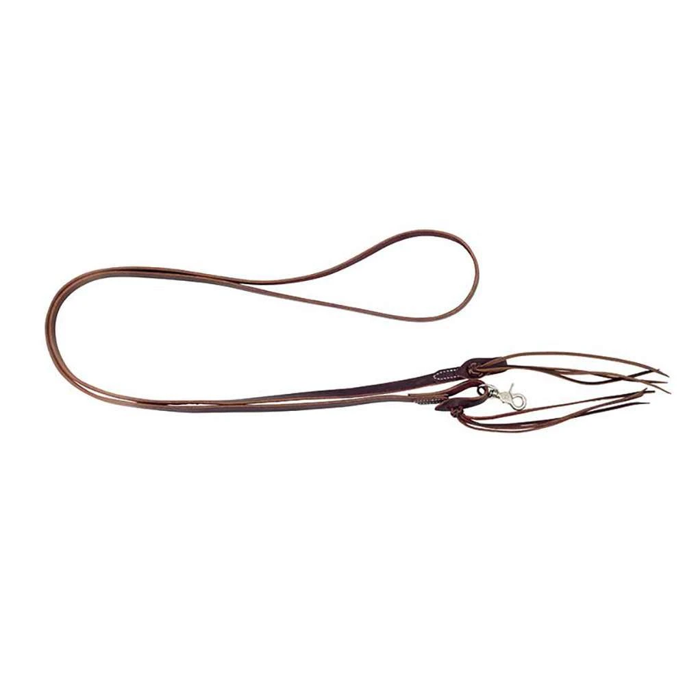 Pineapple Knot Latigo 5/8x8ft Roping Reins are constructed out of burgandy latigo leather, have pineapple knot bit ends, and a scissor snap. These are great for daily ranch work or use them in the show pen! WS2091043131008