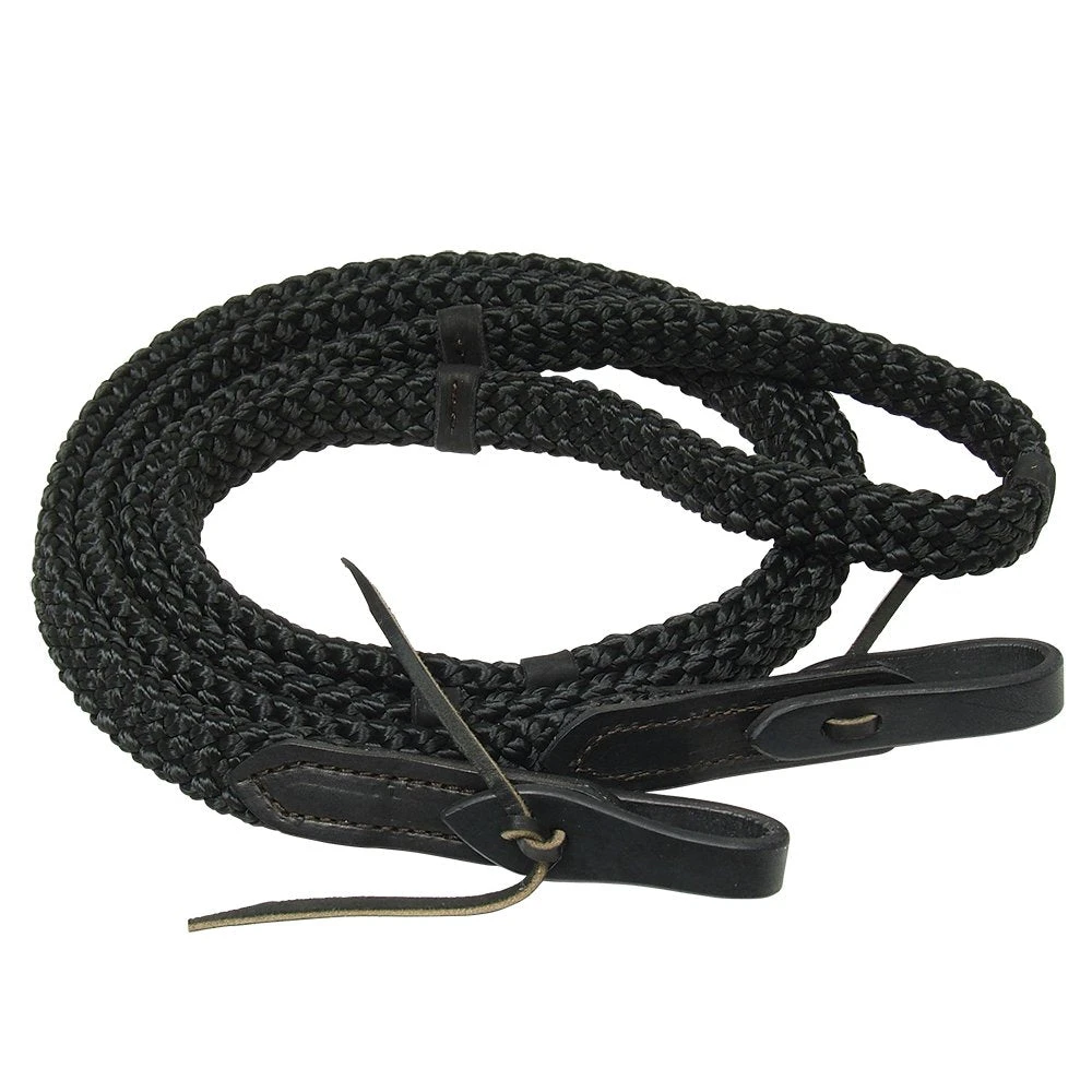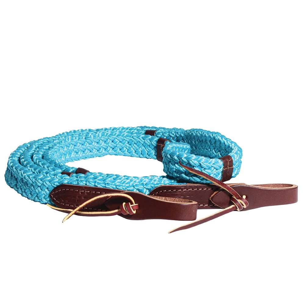 Great for training lessons and trail! 9’ rein has markers for balanced hand placement and is made from a unique polypropylene custom braid that feels soft, yet substantial while providing a good grip in any conditions. Waterloops weight the rein at the bit for better response. New turquoise color is accented with rich chocolate loops and tail-end popper. In colors Turquoise, Purple, Black and Chocolate.