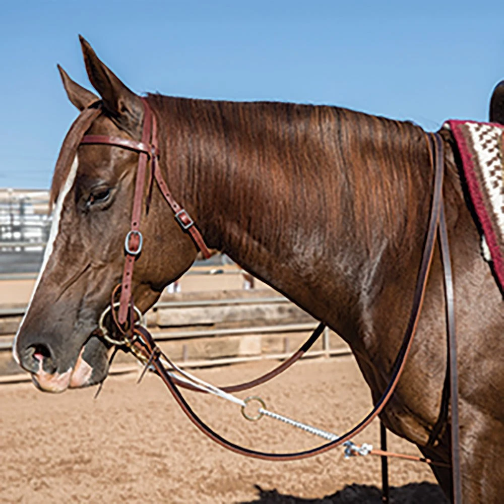 Harness leather with bronze hardware, bungee cord center, sliding nylon rope with snap ends. When the head-setter is adjusted to the desired headset, the horse feels resistance when their head raises and will be rewarded when the head is returned to the desired level. Snaps directly to the bit.