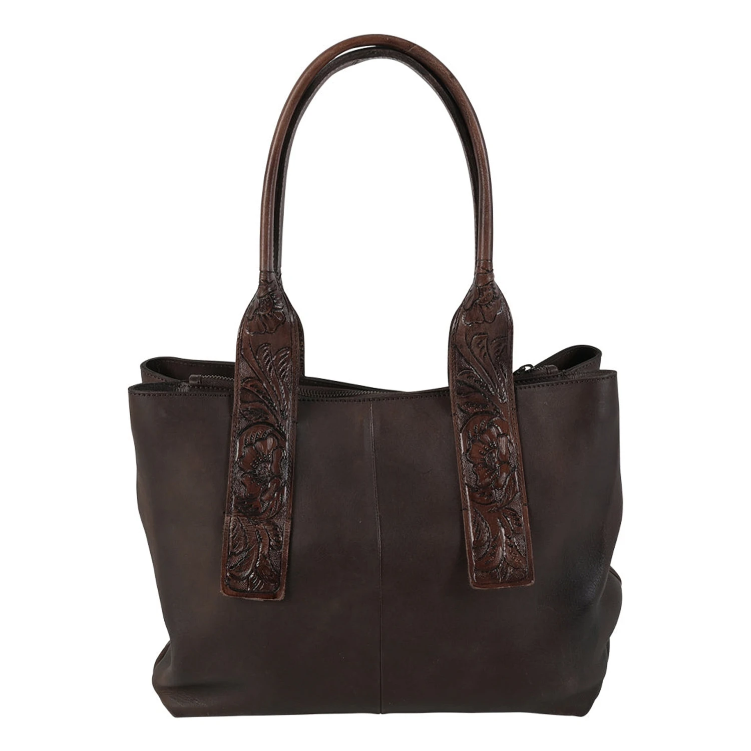 The Westward Tote is crafted in genuine full grain leather with tooled leather accents that only gets more beautiful with use.