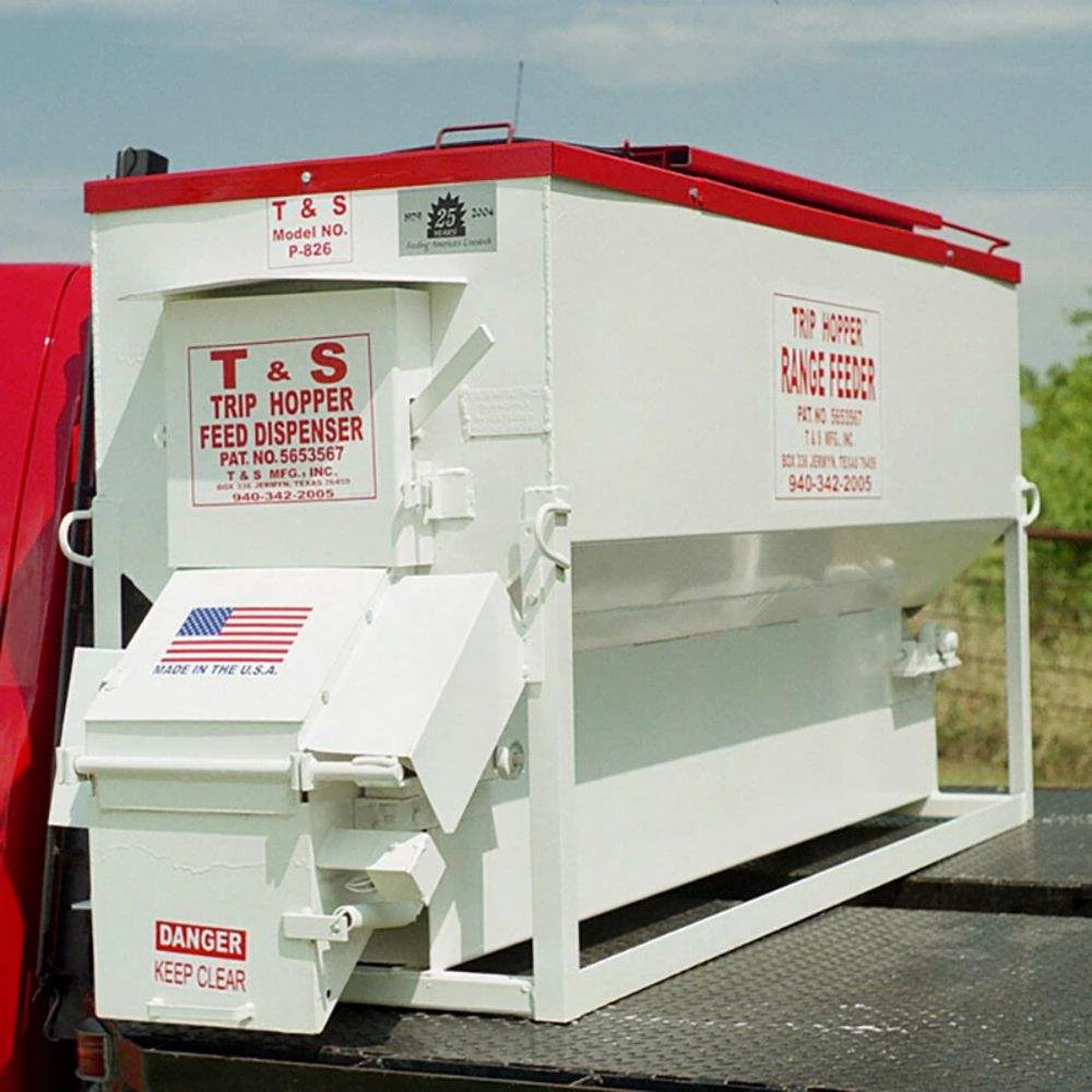 T & S Tripp Hopper Feed Dispenser was originally designed around 30 years ago. After a cold, hard winter, and having to whip the cattle to keep from knocking a person down while feeding, a promise was made that feeding cattle would never be hard again. The T & S Tripp Hopper was originally developed as a trailer model, and did exactly what the Tripp Hopper Feeder does today. There are several models to choose from from feeders that will fit in the back of a truck or across a flatbed, along with trailer models.