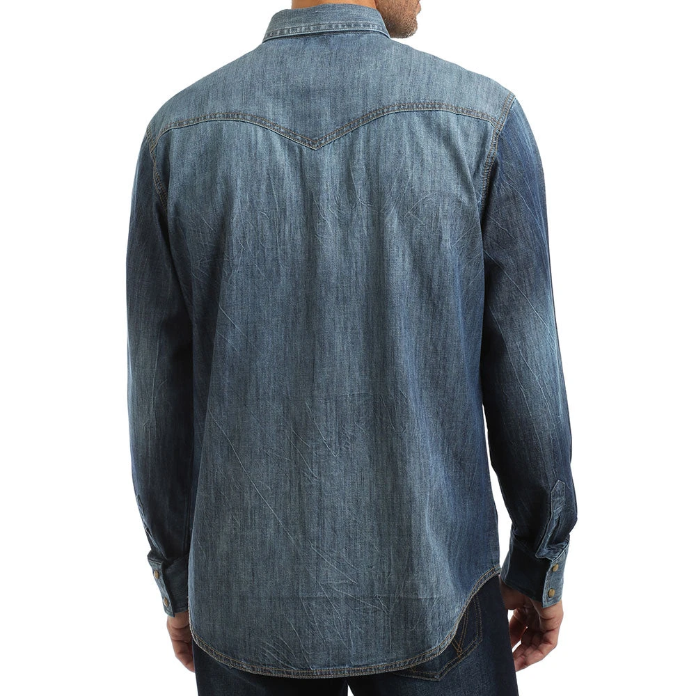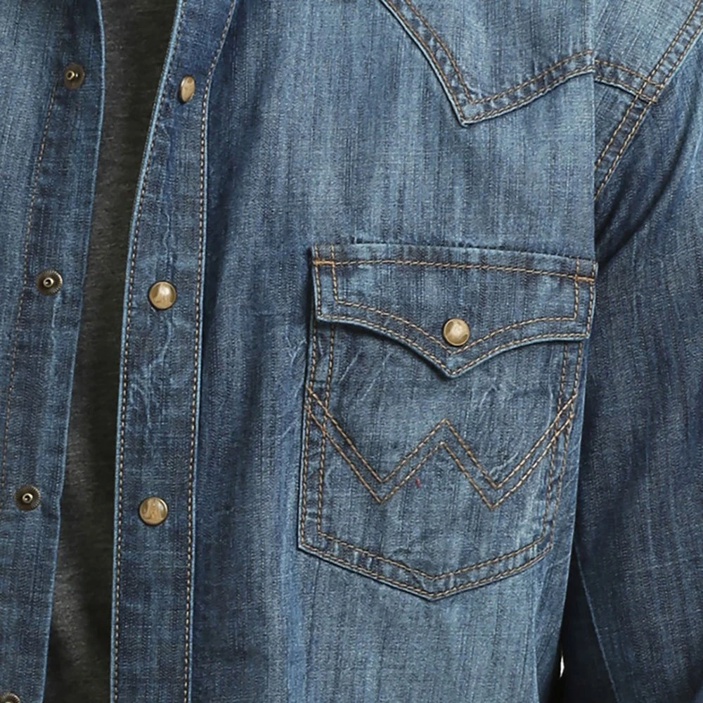 Get your cowboy ready for any event with our retro premium blue denim long sleeve snap shirt from Wrangler!